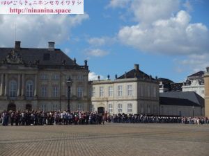 ローゼンボー城から行進でやってくる衛兵さんたちとアマリエンボー宮殿で任務中だった衛兵さんたちが交代するセレモニー。