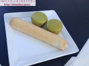 カフェで、クランセスタン(Kranse stang)というアーモンド生地のクッキーとピスタチオのマカロンをいただきました。