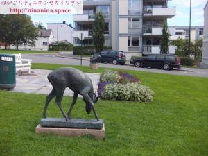 教会の前にある像。左側はシカさんかな?