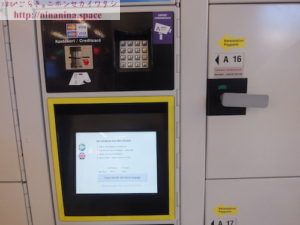 荷物を空いているロッカー(ハンドルが横に上がっていて緑色が表示されている)へ入れ、ドアを閉めたらハンドルを下へ回し3秒ほど待ちます。