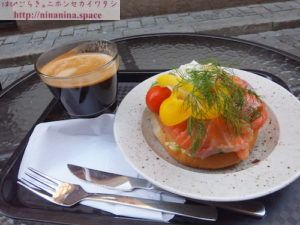 北欧名物のオープンサンドが135.00クローナ(税込)、コーヒーが40.00クローナ(税込)。