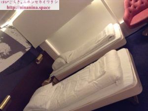 横の白いドアは、隣のキャビンとの連結ドアなので触りません。