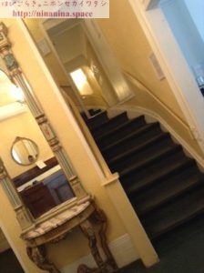 入ってすぐ、レセプションのカウンターがあり、右手に客室へ上がる階段があります。