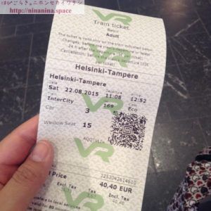 2015年8月22日(土)11:06ヘルシンキ発/12:52タンペレ着、InterCityという車両の二等車(Eco=エコノミー)で、40.40ユーロ(税込)。