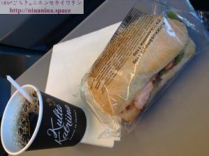 車内販売のワゴンがやってきたので、コーヒーとサンドウィッチを購入。